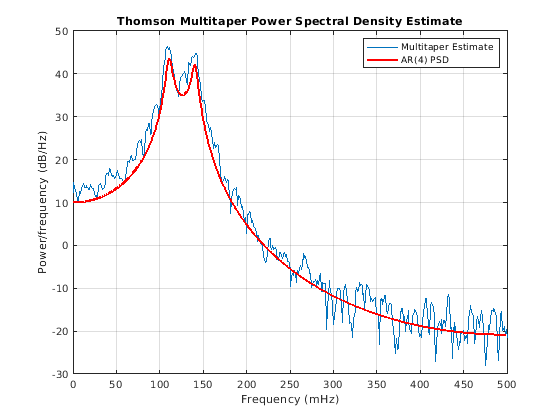 NW = 3.5; figure pmtm(y4,NW,NFFT,Fs) hold on plot(1000*W4,20*log10(abs(H4)),'r','linewidth',2) legend('Multitaper Estimate','AR(4) PSD')