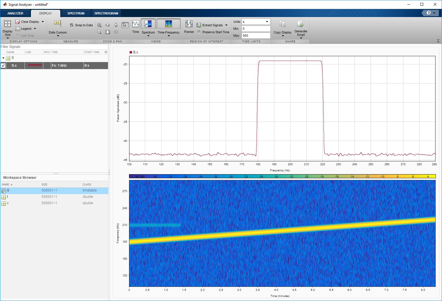 Откройте Signal Analyzer и перетащите расписание с браузера Рабочей области на отображение. Нажмите кнопку Time-Frequency, чтобы добавить представление спектрограммы. На вкладке Spectrogram, под Разрешением Времени, выбирают Specify и вводят разрешение времени 1 секунды. Установите Пределы Частоты к 100 Гц и 290 Гц. Оба компонента сигнала отображаются.