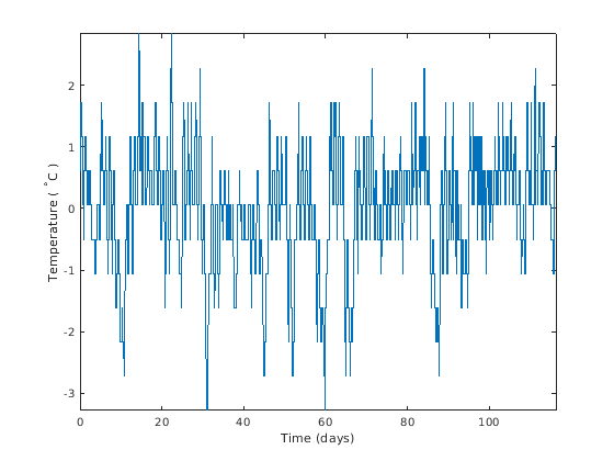 load officetemp tempC = (temp-32)*5/9; tempnorm = tempC-mean(tempC); fs = 2*24; t = (0:length(tempnorm) - 1)/fs; plot(t,tempnorm) xlabel('Time (days)') ylabel('Temperature ( {}^\circC )') axis tight