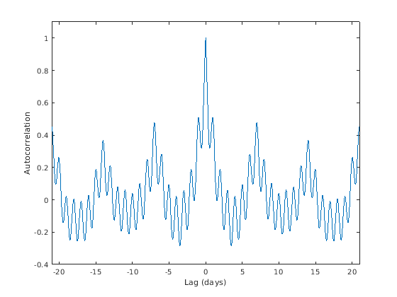 [autocor,lags] = xcorr(tempnorm,3*7*fs,'coeff'); plot(lags/fs,autocor) xlabel('Lag (days)') ylabel('Autocorrelation') axis([-21 21 -0.4 1.1])