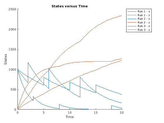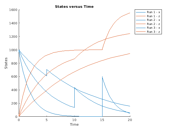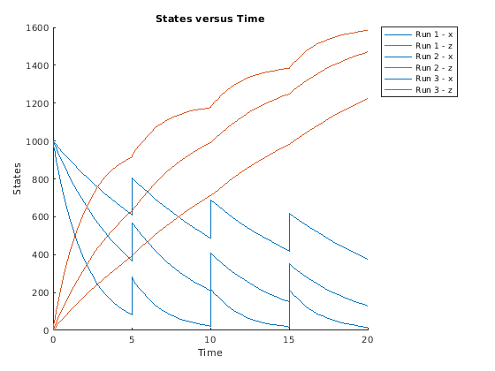 использует входные параметры simdata = F(phi,t_stop,[],t_output)phi, t_stop, пустой дозируемый аргумент [], и t_output. Необходимо задать u, информация о дозах, как пустой array[] для этой подписи. Когда t_output пусто и t_stop задан, симуляции сообщают о моментах времени решателя до t_stop. Когда t_output задан и t_stop пусто, только моменты времени в t_output сообщаются. Когда и заданы, моменты времени, о которых сообщают, являются объединением моментов времени решателя и моментов времени в t_output. Если последний t_output больше соответствующего t_stop, затем доходы симуляции до последнего момента времени в t_output.