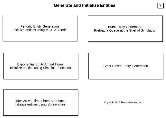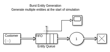 В этом примере показано, как можно сгенерировать несколько сущностей одновременно в начале симуляции, чтобы предварительно загрузить очередь. Чтобы сгенерировать сущности N, время межгенерации для этих сущностей должно быть 0 (нуль). Чтобы остановить генерацию после N сущности, установите время межгенерации на бесконечность (inf).