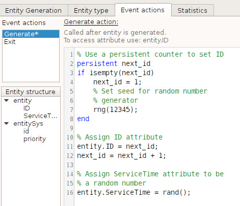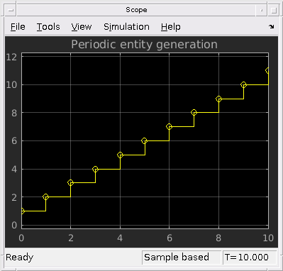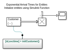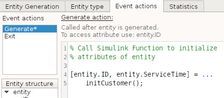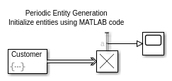 Генерируйте сущности периодически путем устанавливания постоянного значения времени межгенерации в Генераторе Сущности. Можно затем инициализировать эти сущности в Генераторе Сущности с помощью кода MATLAB как показано ниже.