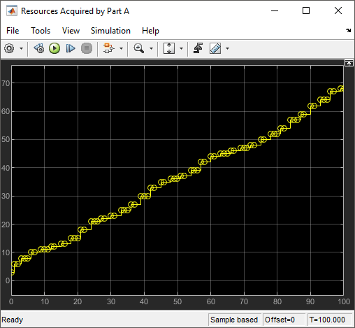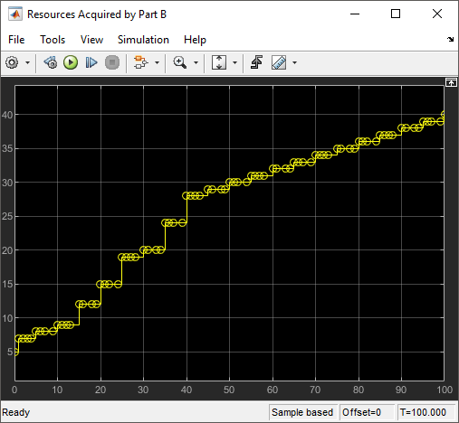 Симулируйте модель. Наблюдайте блок Scope, соединенный с Частью A Чтения Хранилища данных. Осциллограф показывает тот Part A получает 30 ресурсы вокруг времени симуляции 40.