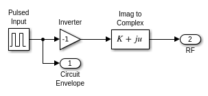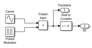 Вход является модулируемым импульсом синусоидальным сигналом полосы пропускания. Для этого конкретного случая я (t) равняюсь нулю, и Q (t) является импульсной модуляцией. Несущие частоты обнуляются в RF Blockset блоки Выходного порта и Inport.