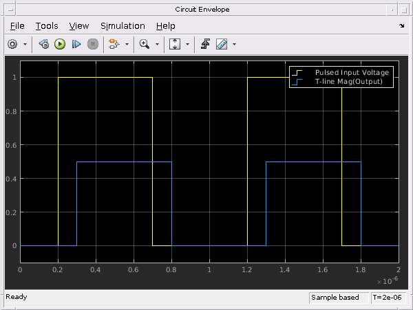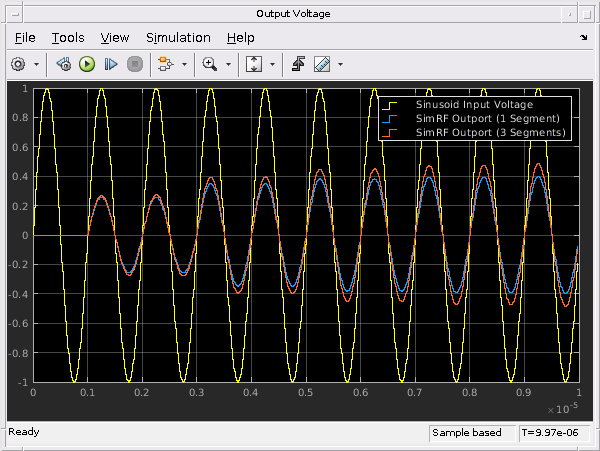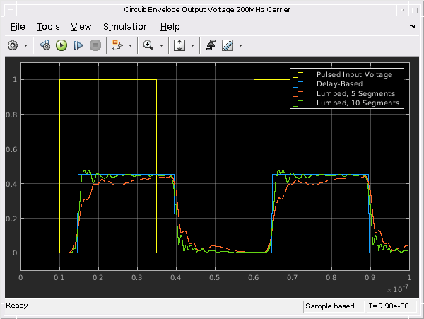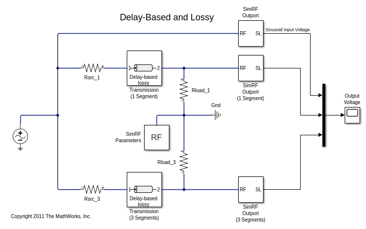 Основанная на задержке модель линии электропередачи с потерями, simrf_xline_seg, состоит из двух параллельных рук, взволнованных RF Blockset синусоидальный источник. Главная рука использует одну линию электропередачи сегмента, в то время как нижняя рука использует линию, состоящую из 3 сегментов. Источник и нагрузочные сопротивления не равны характеристическому импедансу линии электропередачи. Эти различия влияют на форму выходного ответа. Например, выходной ответ будет сверхослаблен, когда источник и нагрузочные сопротивления будут меньше характеристического импеданса.