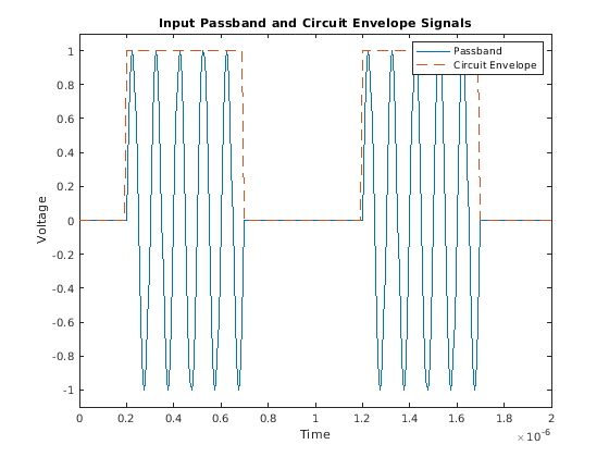 sim(model_pb); hline = plot(SPB_Data(:,1),SPB_Data(:,2),SCE_Data(:,1),SCE_Data(:,2),'--'); legend('Passband', 'Circuit Envelope') title('Input Passband and Circuit Envelope Signals') xlabel('Time') ylabel('Voltage') ylim([-1.1 1.1])