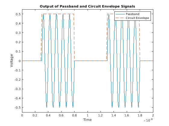 haxis = get(hline(1),'Parent'); plot(haxis,SPB_Data(:,1),SPB_Data(:,3),SCE_Data(:,1),SCE_Data(:,3),'--') legend('Passband', 'Circuit Envelope') title('Output of Passband and Circuit Envelope Signals') xlabel('Time') ylabel('Voltage') ylim([-.55 .55])
