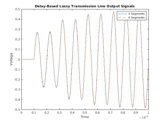 close_system([model_seg '/Output Voltage']); ST_Data3 = ST_Data; set_param([model_seg '/Transmission (3 Segments)'],'NumSegments','4') sim(model_seg); plot(haxis, ST_Data3(:,1), ST_Data3(:,4), ST_Data(:,1), ST_Data(:,4), '--') legend('3 Segments', '4 Segments') title('Delay-Based Lossy Transmission Line Output Signals') xlabel('Time') ylabel('Voltage')
