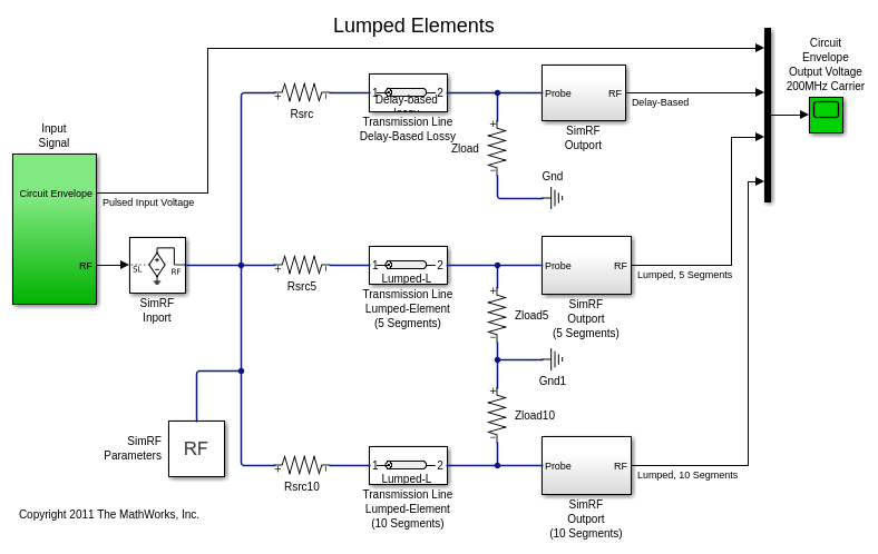 Условный метод для моделирования распределенных линий электропередачи с потерями использует сегменты 2D порта N в каскаде. Каждый сегмент состоит из идеальной линии задержки без потерь и сопротивления, где задержка сегмента равняется общей задержке линии, разделенной на N, и сопротивление сегмента равняется общему сопротивлению линии, разделенному на N. Как количество увеличений сегментов, смешанная модель будет более точно представлять распределенную систему. Эта методология требует компромисса между временем симуляции и точностью модели для увеличения N. В RF Blockset, Number of segments, Resistance per unit length и Line length заданы как параметры диалогового окна в блоке линии электропередачи.