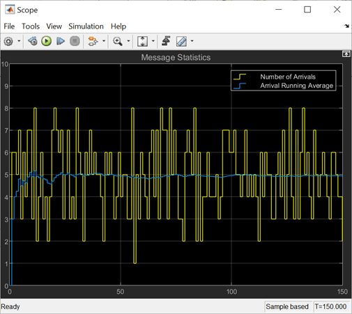 В этом примере очередь сообщений имеет максимальную способность 16 сообщений. Генератор случайных чисел имеет шаг расчета 0,1. Приемник имеет шаг расчета 1. Шаг расчета Приемника сообщения установлен в блоке MATLAB System с помощью getSampleTimeImpl API.