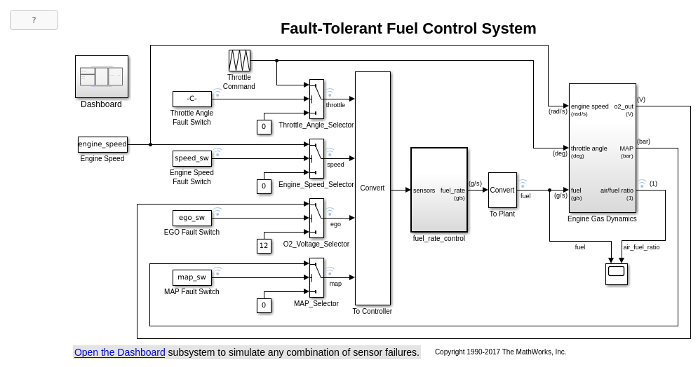 В этом примере показано, как объединить Stateflow® с Simulink®, чтобы эффективно смоделировать гибридные системы. Этот тип моделирования особенно полезен для систем, которые имеют многочисленные возможные операционные режимы на основе дискретных событий. Традиционный поток сигналов обработан в Simulink, в то время как изменения в настройке управления реализованы в Stateflow. Модель, описанная ниже, представляет топливную систему управления для бензинового двигателя. Система очень устойчива в том отдельном датчике, отказы обнаруживаются, и система управления динамически реконфигурирована для непрерывной операции.