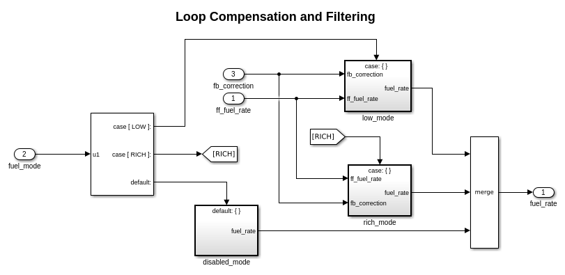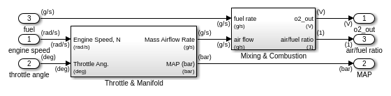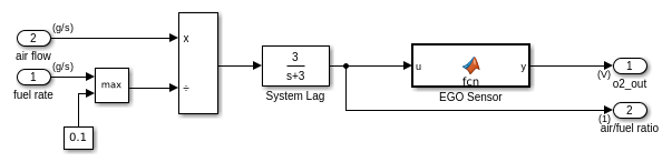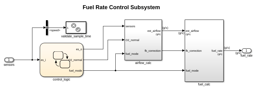 fuel_rate_control использует сигналы от датчиков системы, чтобы определить топливный уровень, который дает стехиометрическую смесь. Топливный уровень объединяется с фактическим воздушным потоком в модели динамики газа механизма, чтобы определить получившееся отношение смеси, как обнаружено в выхлопе.