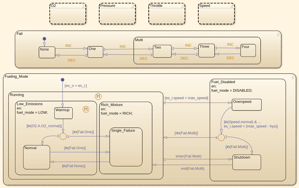 Когда выполнение начинается, все состояния запускаются в их normal режим за исключением кислородного датчика (EGO). O2_warmup состояние вводится первоначально, пока период прогрева не завершен. Система обнаруживает дроссель и отказы датчика давления, когда их измеренные значения выходят за пределы их номинальных областей значений. Разнообразный вакуум в отсутствие сигнала скорости указывает на отказ датчика скорости. Кислородный датчик также имеет номинальную область значений для условий отказа, но, потому что нуль является и минимальным уровнем сигнала и нижней частью области значений, отказ может быть обнаружен только, когда это превышает верхний предел.