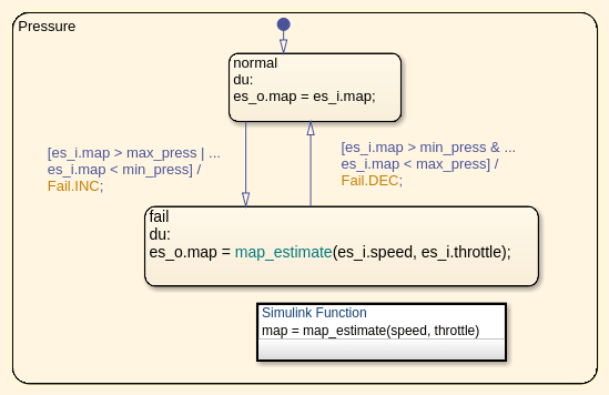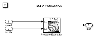Модель вычисляет оценку разнообразного давления в зависимости от положения дросселя и скорости вращения двигателя. Чтобы вычислить значение, модель использует функцию Simulink в Stateflow.