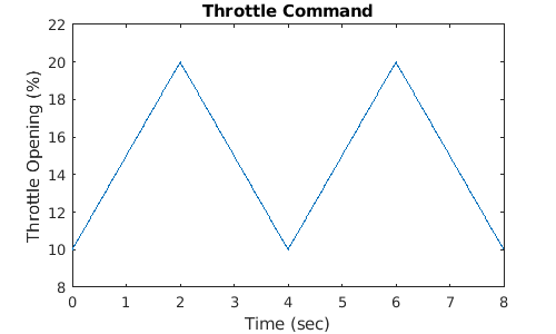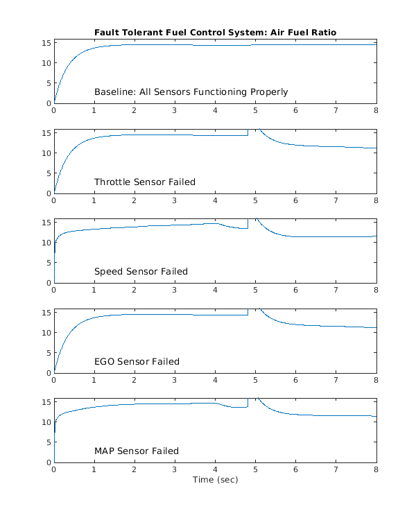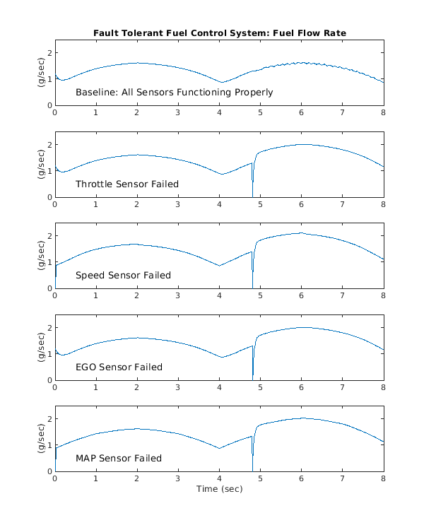 Рисунок 11 сравнивает топливную скорость потока при безотказных условиях (базовая линия) с уровнем, примененным в присутствии одного отказа в каждом датчике индивидуально. В каждых документах по делу нелинейное отношение между топливом текут и треугольная команда дросселя (показанный в рисунке 13). В базовом случае топливный уровень отрегулирован плотно, показав маленькую пульсацию из-за переключающейся природы входной схемы датчика EGO. В других четырех случаях система управляет разомкнутым контуром. Стратегия управления доказана эффективной при поддержании правильного топливного профиля в одно типе отказа. В каждом из условий отказа топливный уровень - по существу 125% базового потока, выполняя цель проекта 80%-х богатых.