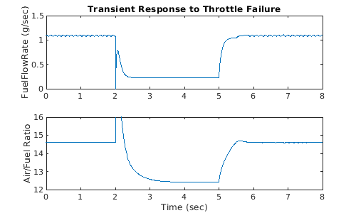 Переходное поведение системы показывают в рисунке 14. С постоянными 12 углами дросселя степени и системой в установившемся, отказ дросселя введен в t = 2 и откорректирован в t = 5. В начале отказа, топливных повышений ставки сразу. Эффекты замечены в выхлопе, когда богатое отношение распространяет через систему. Установившееся условие затем быстро восстанавливается, когда операция с обратной связью восстанавливается.