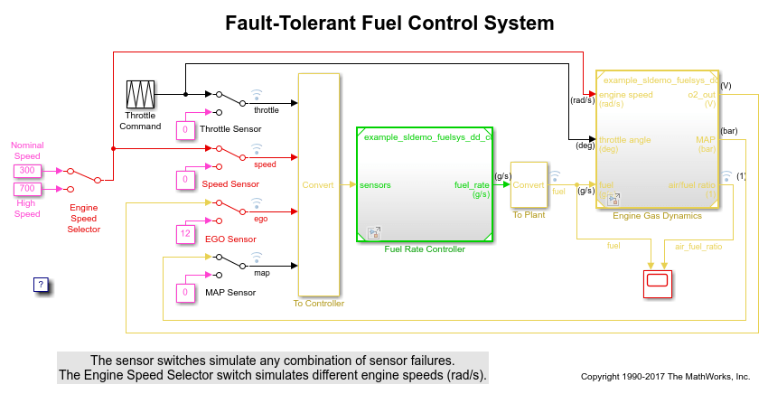 Этот пример использует модифицированную версию sldemo_fuelsys_dd модель, (Моделирование Отказоустойчивого Топливного примера Системы управления) модель с замедлением, искусственно вставленным.