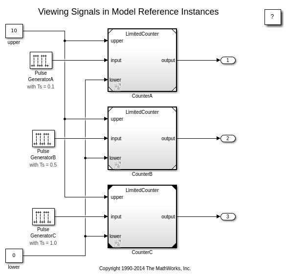 Например, можно использовать Инспектора Данных моделирования, чтобы просмотреть output сигнал двух из экземпляров модели LimitedCounter. В Инспекторе Данных моделирования вы видите тот CounterA увеличения более быстро, чем CounterB. Это поведение ожидается, потому что Импульсный Генератор, управляющий этой моделью, запускается на более быстром уровне.