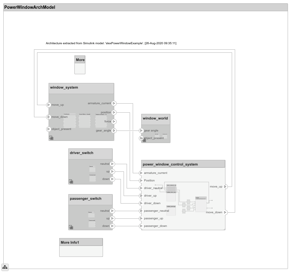 Смоделировать архитектуру системы в Simulink® среда, рассмотрите использование программного обеспечения System Composer и Simulink Requirements™.