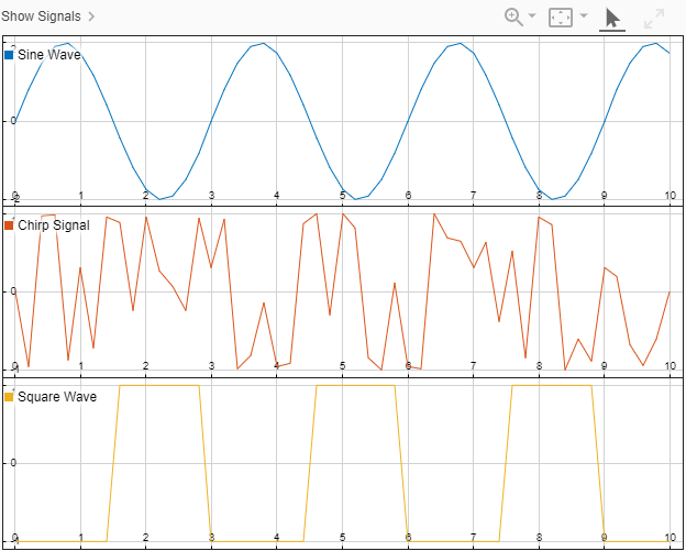 Чтобы построить сигналы в графиках временной зависимости, расширьте таблицу сигналов путем нажатия на Show Signals в верхнем левом. Установите флажок рядом с сигналом, который вы хотите построить на выбранном подграфике, обрисованном в общих чертах в синем. Например, постройте Sine Wave сигнал в первом подграфике. Затем выберите другой подграфик и постройте Chirp сигнал. Выберите итоговый подграфик и постройте Square Wave сигнал.