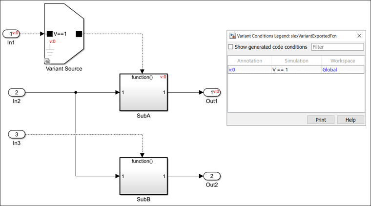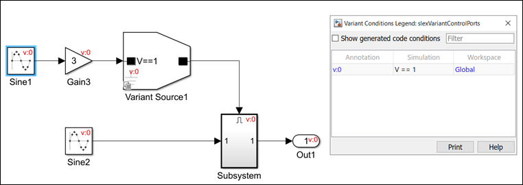 Когда вы симулируете модель после установки V=1, условие V==1 распространяет к выходному порту Variant Source1 и затем к порту управления Subsystem. Условие, присвоенное блоку подсистемы затем, распространяет с блоками под названием Sine2 и Out1 соединенный с его портами ввода и вывода. Если вы устанавливаете V к значению кроме 1, Simulink отключает все блоки, соединенные с импортом и выходным портом Variant Source1.