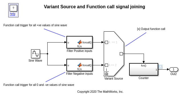 Параметр вызова Выходной функции на Variant Source1 блок установлен в on. Это позволяет блоку получить и вывести сигналы вызова функции. Чтобы включить эту опцию программно, используйте эту команду: