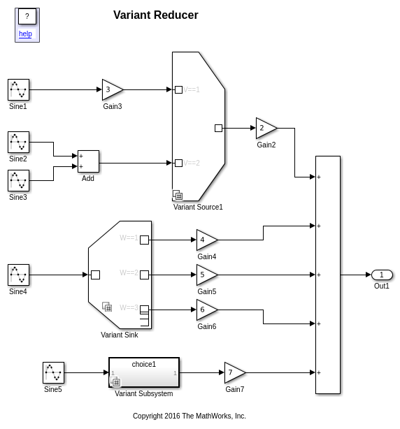 Откройте модель slexVariantReducer. Модель содержит Различный Исходный блок, блок Variant Sink и Различный блок Subsystem с этими вариантами: