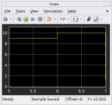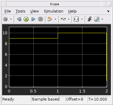 Откройте модель и запустите симуляцию, чтобы видеть исходный выход scope. Симуляция запускается для 10 временных шагов, подходящих 1 на каждом временном шаге.