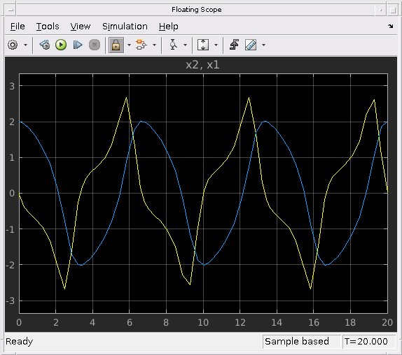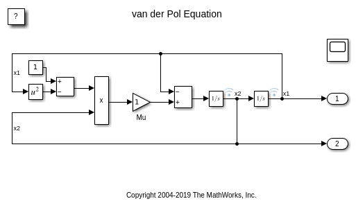 Этот пример использует модифицированную версию vdp модель. В этом примере плавающий осциллограф соединяется с x1 и x2 сигналы.