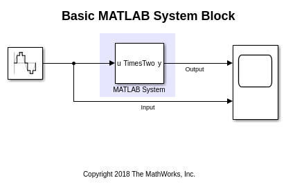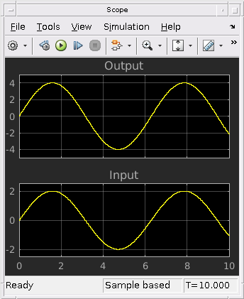 Эта модель имеет блок MATLAB System с помощью Системного объекта TimesTwo то, что множители вход два. Вход с блоком MATLAB System обеспечивается блоком Sine Wave. Вывод наряду с входом отображен в блоке Scope. Когда вы запускаете модель, вы видите, что вход с блоком MATLAB System умножен на два в блоке Scope.