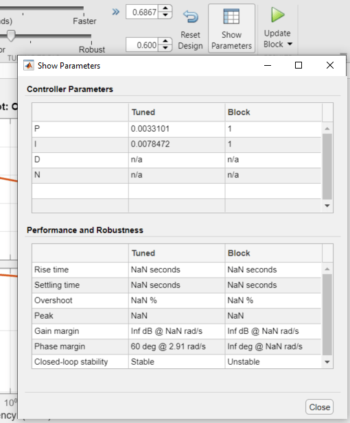 Цикл ПИДа включает ПИ-контроллер в параллельную форму, которая управляет углом дросселя, чтобы управлять скоростью вращения двигателя. ПИ-контроллер имеет усиления по умолчанию, который заставляет систему замкнутого цикла колебаться. Мы хотим спроектировать контроллер, использующий PID Tuner, который запускается от диалогового окна блока PID.