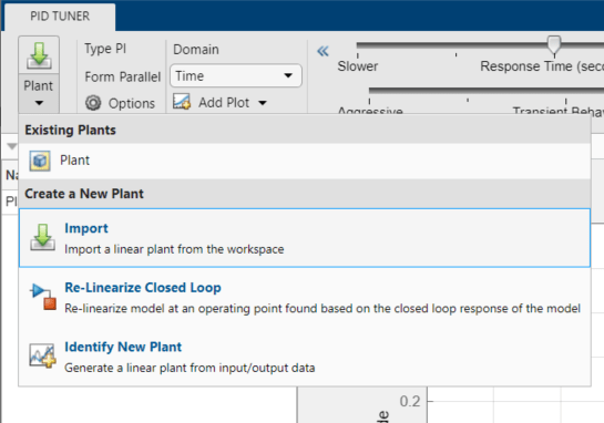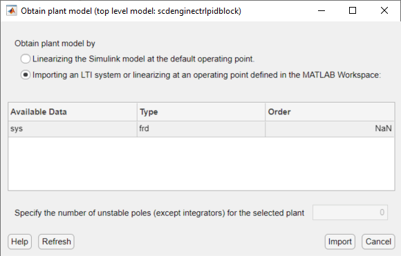 sys frd система, которая представляет частотную характеристику объекта в начальной рабочей точке. Чтобы использовать его в PID Tuner, мы должны импортировать его после того, как PID Tuner будет запущен. Нажмите Plant и выберите Import. Частота дискретизации импортированного frd объект должен совпадать с частотой дискретизации блока PID Controller.