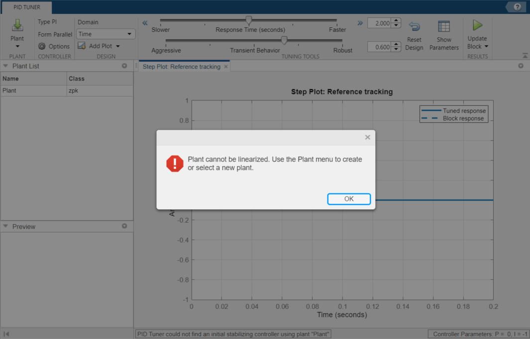 Чтобы запустить PID Tuner, откройте диалоговое окно блока PID и нажмите Tune. Информационное диалоговое окно открывает и указывает, что модель объекта управления, линеаризовавшая в начальной рабочей точке, имеет нулевое усиление и не может использоваться, чтобы спроектировать ПИД-регулятор.