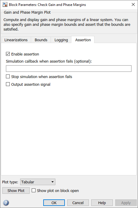 На вкладке Assertion блок сконфигурирован, чтобы выдать предупреждение, когда утверждение перестало работать, то есть, когда запасам по амплитуде и фазе не удовлетворяют.