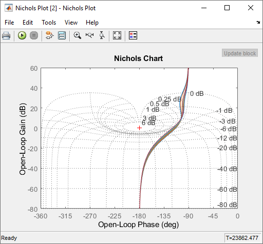Поля, которые нарушают заданные границы, отображают красным. Связанный запас по фазе нарушен к концу симуляции, когда топливная масса и скорость самолета понизились. График Николса показывает маленькие изменения ответа цикла как топливная загрузка и изменение самолета скорости.