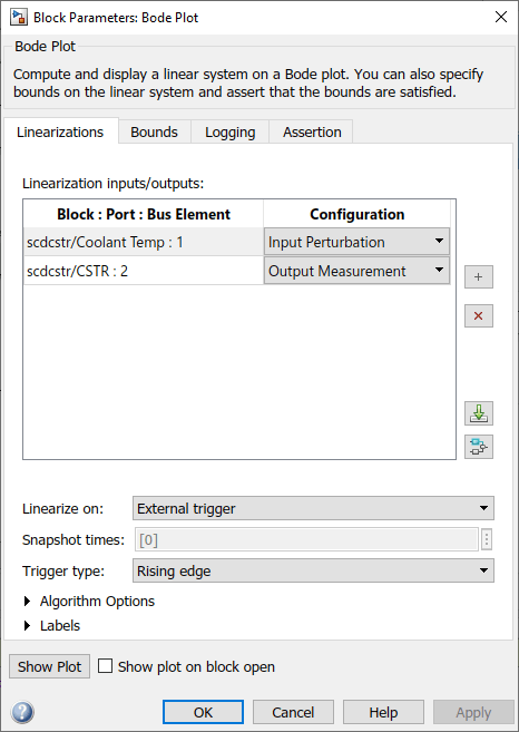 Блок Bode Plot сконфигурирован, чтобы выполнить линеаризацию на возрастающих ребрах внешнего триггерного сигнала. Триггерный блок сигнала Линеаризации вычисляет триггерный сигнал и производит возрастающее ребро, когда остаточная концентрация удовлетворяет любому из следующих условий.