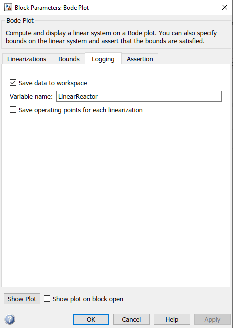 Реакторная модель содержит блок Bode Plot из библиотеки Simulink Control Design Linear Analysis Plots. Блок сконфигурирован с: