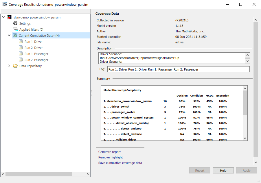 Соберите покрытие в процессе моделирования, чтобы измериться который элементы в вашей модели или Stateflow® графики тестируются. Simulink® Coverage™ измеряет несколько типов покрытия, таких как выполнение, решение, условие и измененное условие/Decision Coverage. Самый основной уровень покрытия определяет, выполняется ли элемент в процессе моделирования, в то время как более обширные уровни покрытия определяют, осуществлены ли отдельные логические условия полностью и независимо влияют на выход логических выражений.