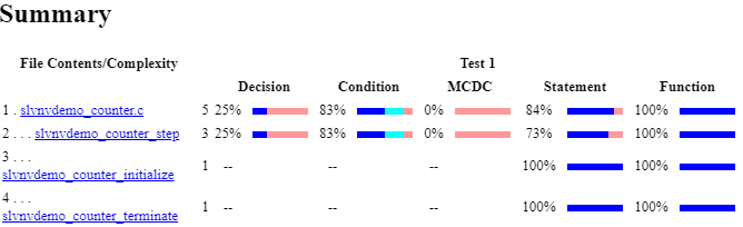 Раздел Summary покрытия кода сообщает о ссылках на каждый исходный файл и функцию. В этом примере нажмите slvnvdemo_counter_step. Отчет покрытия кода переходит к функции с именем slvnvdemo_counter_step. В разделе 2.1, вы видите что оба условия в решении (!(slvnvdemo_counter_U.upper >=z rtb_input)) || (! rtb_inputGElower), | являются ложными, навсегда продвигается.