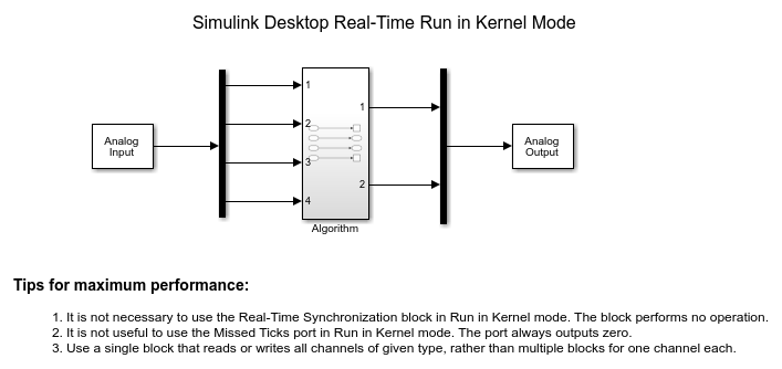 Simulink Desktop Real-Time поддерживает эффективность в реальном времени с более низкой частотой дискретизации для симуляции режима Connected IO в Simulink и поддерживает более высокие частоты дискретизации для симуляции режима Run in Kernel в Simulink с Simulink Coder™.