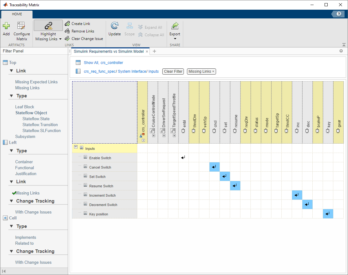 Задайте, как требования относятся к блокам Simulink, объектам Stateflow, сгенерированному коду, и друг другу.