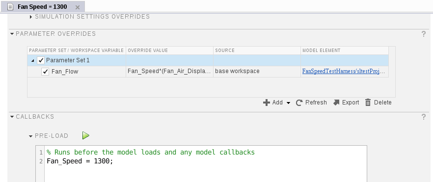 Коллбэки предварительной нагрузки содержат команду, чтобы установить скорость вентилятора для каждого теста под Fan Speed Parametric Study testsuite. Переопределения параметра содержат команду, чтобы повторно вычислить поток воздуха вентилятора от скорости вентилятора, и затем заменить параметр тестовой обвязки. Можно просмотреть эти команды в разделе Callbacks и Parameter Overrides каждого теста.