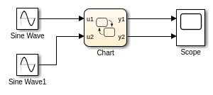 Эта модель содержит два Sine wave (Simulink) блоки: один с частотой 1 радиана в секунду и другим с частотой 2 радианов в секунду.