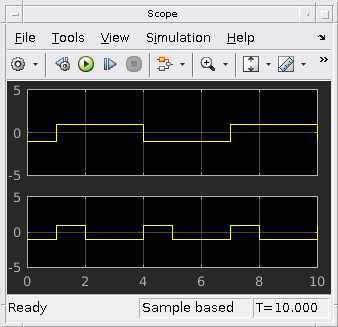 График состоит из двух соединенных атомарных субдиаграмм от той же библиотеки. Обе атомарных субдиаграммы содержат логику сатуратора, чтобы преобразовать входную синусоиду в выходную прямоугольную волну той же частоты.
