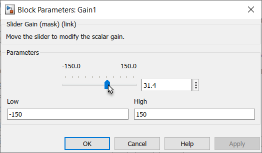 Первоначально, оба входных параметров и оба выходных параметров к графику являются нулем. Чтобы изменить значение входных параметров графика, дважды кликните блоки Усиления и перетащите ползунок.