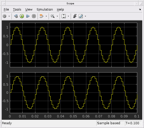 Когда вы симулируете модель, блок Scope отображает два сигнала. Главный сигнал показывает версию фиксированной точки входа синусоиды к графику. Нижний сигнал соответствует отфильтрованному выходу из графика. Фильтр удаляет высокочастотные значения из сигнала, но позволяет низкочастотным значениям проходить через неизменный график.