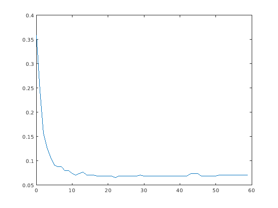 L_noInteractions = kfoldLoss(CVMdl,'Mode','cumulative','IncludeInteractions',false); figure plot(0:min(CVMdl.NumTrainedPerFold.PredictorTrees),L_noInteractions)
