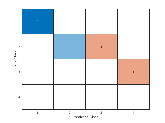 Вторая строка матрицы беспорядка C показывает, что одна из точек данных, которые, как известно, были в группе 3, неправильно классифицируется в группу 4. Третья строка C показывает, что одна из точек данных, принадлежащих группе 2, неправильно классифицируется в группу 3, и четвертая строка показывает, что эти две точки данных, которые, как известно, были в группе 1, классифицируются правильно. confusionmat обрабатывает NaN значение в сгруппированной переменной g2 как отсутствующее значение и не включает его в строки и столбцы C.