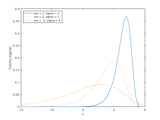 Figure contains an axes object. The axes object contains 3 objects of type line. These objects represent mu = 2, sigma = 1, mu = 0, sigma = 2, mu = -2, sigma = 4.